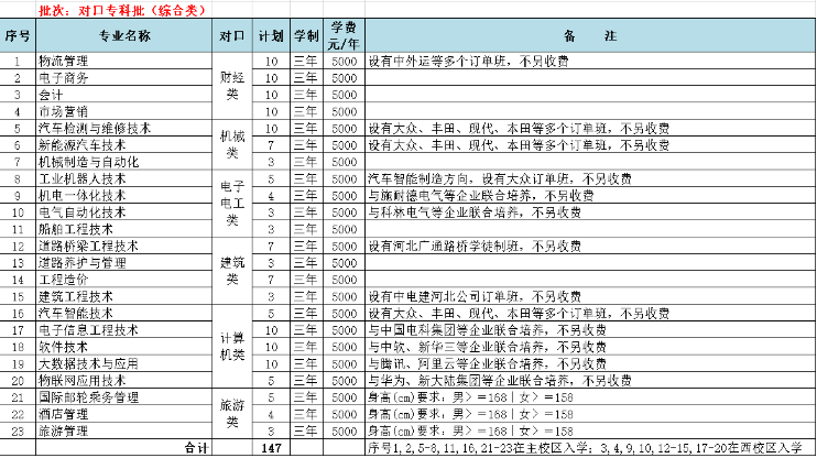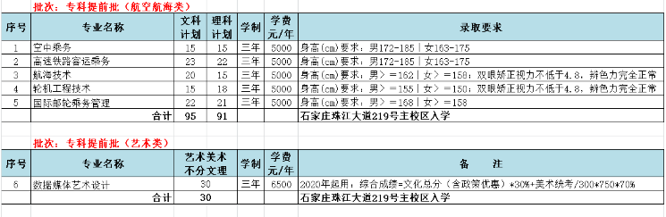 學院現(xiàn)有在校大學生14000余名。2020年招生計劃5300人(不含3+2轉(zhuǎn)段,較往年增加600人),其中河北省高職單招已錄取2350人,省外投放538人,省內(nèi)剩余計劃2412人(考生填報志愿學院代號0650普通文科考生依據(jù)河北省教育考試院編考試與招生《2020年河北省普通高等學校招生計劃》文科含對口招生冊:文史專科提前批第125頁,專科批第146-147頁,藝術(shù)類美術(shù)統(tǒng)考專科提前批第246頁,對口專科批財經(jīng)類第290頁,對口專科批機械類第294頁,對口口專科批電子電工類第296頁,對口專科批建筑類第297頁,對口專科批計算機類第299頁,對口專科批旅游類第302頁。理工類考生依據(jù)《2020年河北省普通高等學校招生計劃》理科招生冊:理工專科提前批第287頁,專科批第311-312頁,藝術(shù)類美術(shù)統(tǒng)考專科提前批第416頁)。各批各類分專業(yè)招生計劃如下: